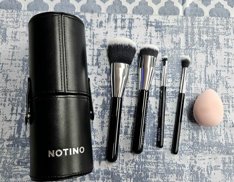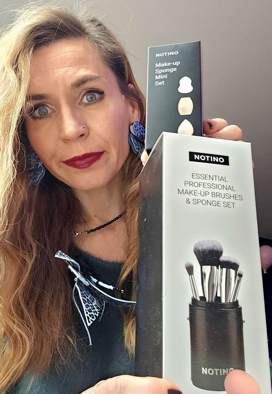 Am mai luat și setul de pensule de machiaj Notino cu etui și patru pensule, pentru că am auzit de foarte bine despre ele și niciodată nu am pensule ca lumea, și setul de bureței pentru aplicarea fondului de ten. Pensulele sunt aici, 161 de lei. Bureții sunt 31 de lei, aici. Etuiul e de bună calitate, solid și ușor.