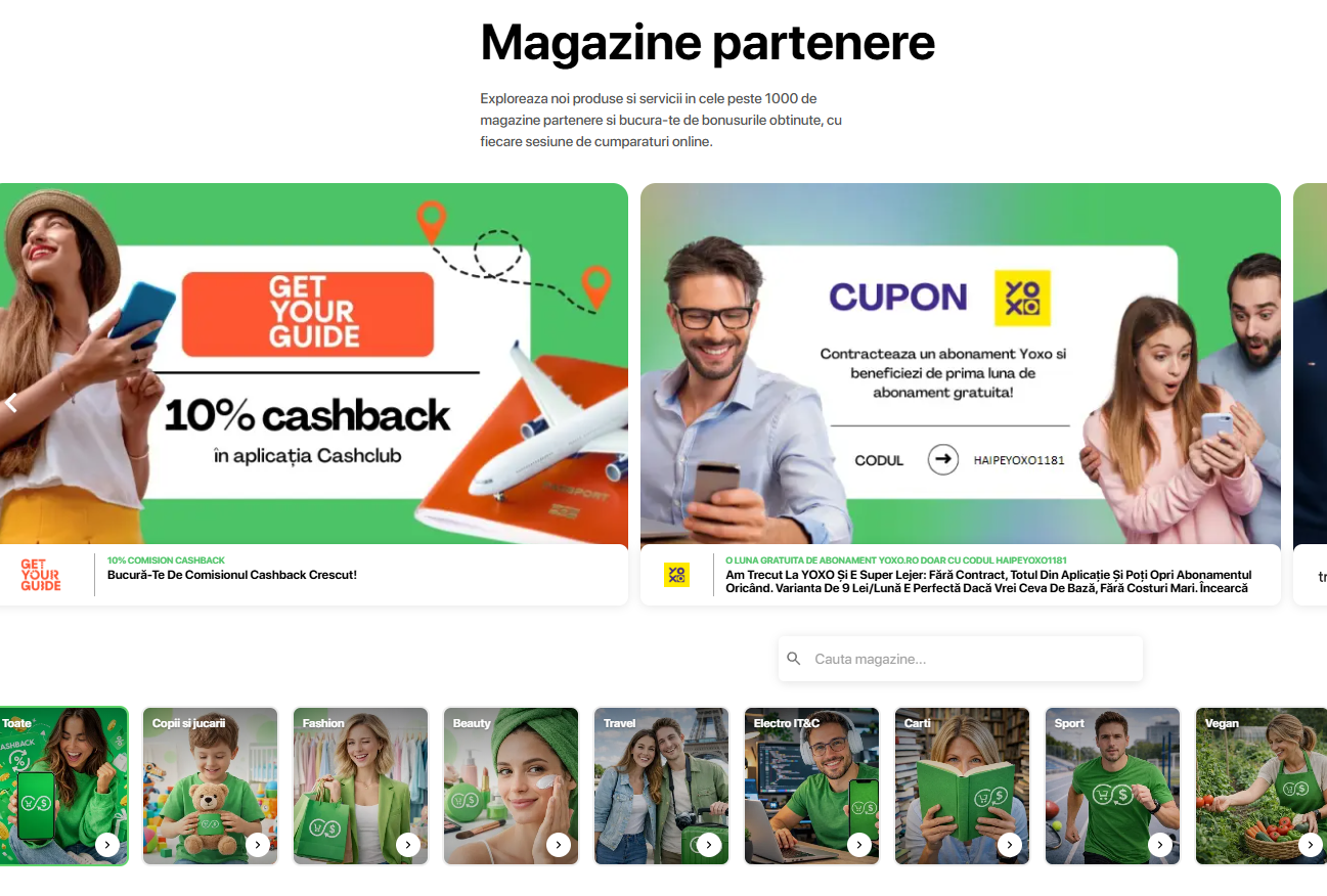 La multe, sunt peste 1.300 de magazine partenere din România și străinătate, de la agenții de turism la librării, magazine de haine, cosmetice, IT, companii de telefonie mobilă, le vedeți pe toate aici, cu procentul de cashback oferit (care variază în funcție de perioadă).